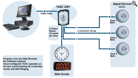 The TASC unit allows for total synchronization of your factory bells or horns as well as operate analog and digital wall clocks throughout your facility.
